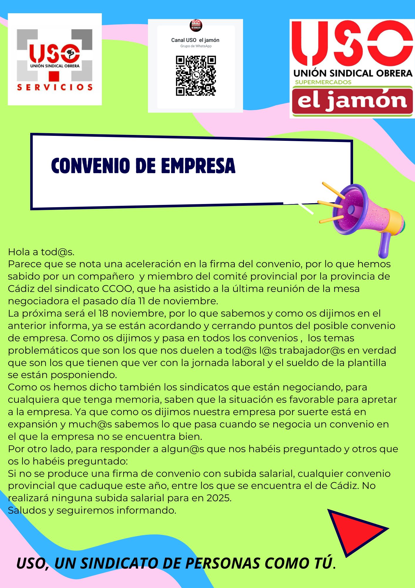 La próxima será el 18 noviembre, por lo que sabemos y como os dijimos en el anterior informa, ya se están acordando y cerrando puntos del posible convenio de empresa. Como os dijimos y pasa en todos los convenios , los temas problemáticos que son los que nos duelen a tod@s l@s trabajador@s en verdad que son los que tienen que ver con la jornada laboral y el sueldo de la plantilla se están posponiendo.