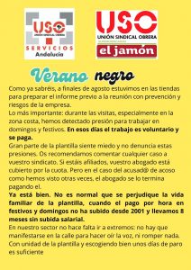 Compañer@s como muchos sabéis y habéis vivido, las aperturas de domingos y festivos ha sido una auténtica locura, quedándose varios compañer@s incluso sin librar tres meses enteros ( junio, julio y agosto). ESTOS DÍAS SON VOLUNTARIOS Y SE PAGAN, y en varias tiendas hemos detectado presión para trabajar estos días aprovechando el miedo de gran parte de la plantilla.